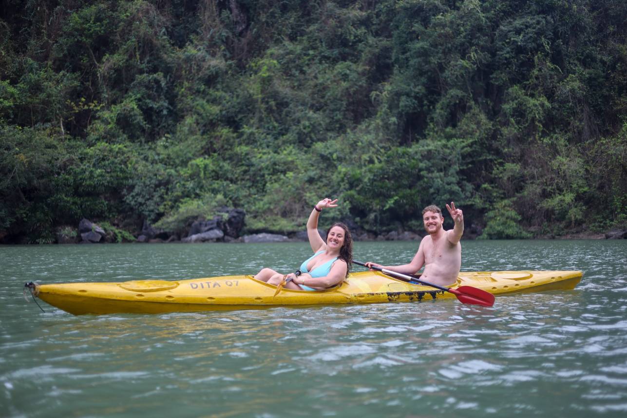 Your Halong Bay 3 days 2 nights cruise leads to the Drum Area and the stunning Parachute Cave. Everyone paddles through the calm waters and swims in the turquoise lagoons while discovering hidden gems of the bay. Note, however, that if the weather conditions shift, the itinerary might bring you to the mystical Drum Cave or Fairy Lake, all of which are equally enchanting alternatives!